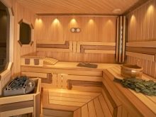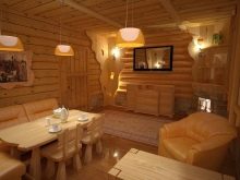 Салонът е мястото за вечеря и гледане на телевизия. Стените на това помещение са обшити с дървена дъска, а понякога се използват листове от неръждаема стомана с дебелина 2-3 мм. Такава баня перфектно ще поддържа оптималната температура, което ще спести кубически метра дърва за огрев или въглища..