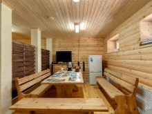 Размерът на стаята е 6×6 метра, повече от достатъчно, за да побере всички важни елементи. Рационално е да затоплите стаята за отдих с помощта на печка, която е в непосредствена близост до тази стая. В съблекалнята обикновено поставят всичко необходимо за приятно забавление – маси, столове, кухненски шкафове, камина. Често има и кухня с хладилник, газова печка и микровълнова печка..