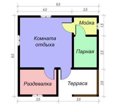 Оптималните размери за такива конструкции обикновено са 6×6 метра. В такава зона лесно можете да поставите най -необходимите неща. Площта за баня 6×6 метра може да се нарече идеален формат за баня. Такива параметри позволяват да се подредят всички необходими помещения, да се доставят необходимите мебели, както и отоплително оборудване. Такива размери на стаята осигуряват добра почивка за 8-10 души едновременно.