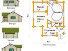 Това е интересен проект на къща за баня. В зависимост от размера на тавана, той може да бъде оборудван като фитнес, съблекалня или баня. Можете да го разделите на две части, като поставите гореща вана в едната, а парна баня и съблекалня в другата.. Таванското ниво може да се използва за оборудване на басейн, разположен между двете спални. Такава сграда може да служи като къща за гости..