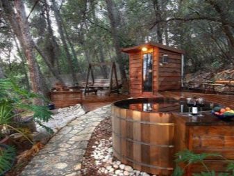 В интернет можете да намерите необичайни идеи за изграждането на баня с басейн. Повечето от тях включват поставяне на шрифта на улицата в непосредствена близост до парната баня. Такъв басейн е защитен от ветрозащитни форми под формата на дървета и храсти. Около купата се полагат пътеки от тротоарни плочи. Приятно е да ходиш по него бос и не се страхува от вода.