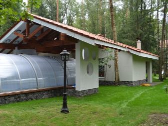 Тази опция е подходяща за строителство в средната секция. Подреждането на резервоара се намира на улицата, което сериозно спестява място във ваната. Терасата, ако желаете, може да бъде остъклена или направена в сграда за басейна.