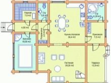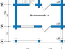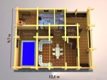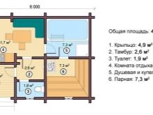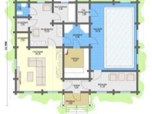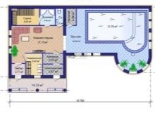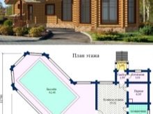 Това е интересен проект на къща за баня. В зависимост от размера на тавана, той може да бъде оборудван като фитнес, съблекалня или баня. Можете да го разделите на две части, като поставите гореща вана в едната, а парна баня и съблекалня в другата.. Таванското ниво може да се използва за оборудване на басейн, разположен между двете спални. Такава сграда може да служи като къща за гости..