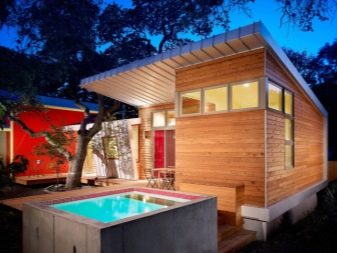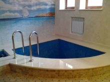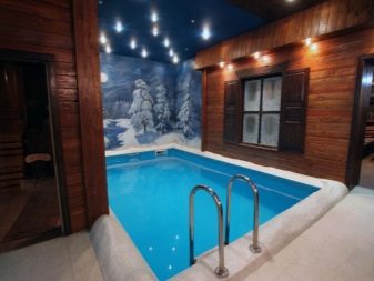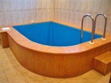Дизайнът на басейн за сауна винаги трябва да се основава на редица важни въпроси. Необходимо е да се реши къде ще се намира шрифтът, как ще се използва и какъв размер ще бъде. Размерите и формите на контейнера могат да бъдат абсолютно всякакви, всичко зависи от желанията и възможностите на собственика. Например, конструкцията може да има ъглова форма и да се намира в стая с панорамни прозорци..