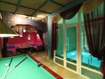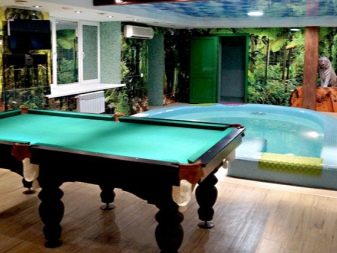 Това е отлично решение за комбиниране на процедури за баня с релаксация. Ако размерът на обекта не позволява, тогава можете да построите двуетажна сграда, като на първия етаж поставите парна баня, съблекалня и пералня, а на втория-зона за отдих с билярд. Този проект включва разположението на купата в сградата, което осигурява захранване с топла вода. За изграждането на билярдна стая в комплекса за баня е необходимо да се инсталира канализационна система за източване на отпадни води и фурна за отопление на тавана.