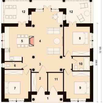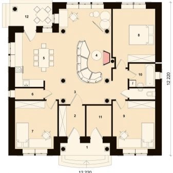В много съвременни проекти на вили 12 на 12 метра се използва комбинацията от няколко пространства.. Например, можете да комбинирате кухня с хол или трапезария с кухня или хол с трапезария. Удобно е, ако те ще бъдат разположени на разстояние от спалните, за да се избегнат ненужни звуци. Комбинираните пространства ви позволяват да приемате големи групи гости и да провеждате партита у дома.