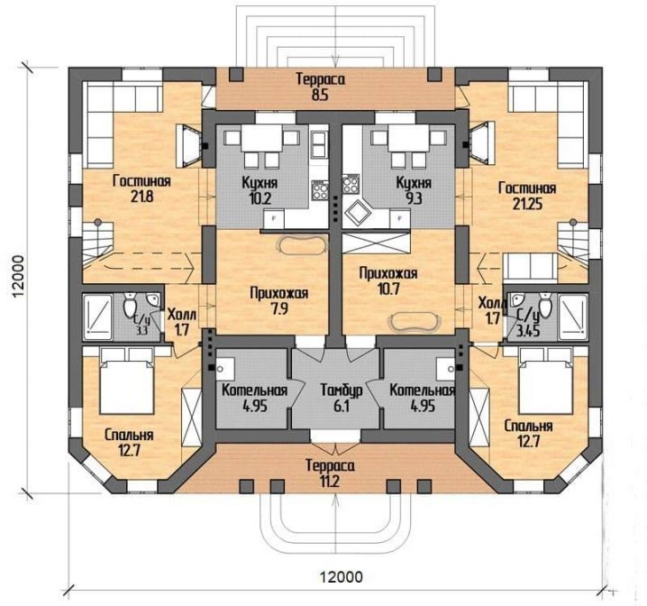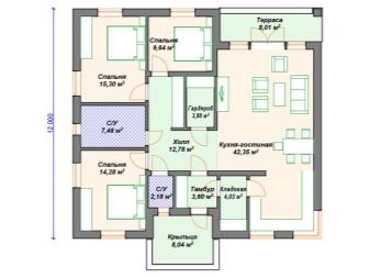 Има голям брой проекти за едноетажни сгради 12×12 метра и доста често те са направени с подземен етаж. Благодарение на високата основа / цокъл, може да се осигури добра дневна светлина. Това е особено вярно, ако са избрани широки прозорци..