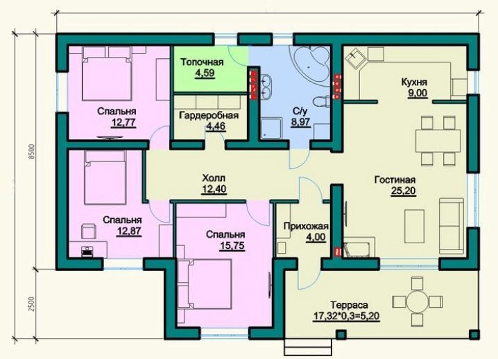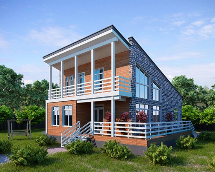 Семейства от пет души най -често избират къщи с покрита веранда, просторен коридор, отделно котелно помещение, уютен хол и три спални. Оптималните допълнения ще бъдат две бани, веранда, вестибюл и офис. Ако размерът на верандата позволява, тогава може да се организира тераса върху нея през топлите месеци. Подходящ е и като допълнително помощно помещение..