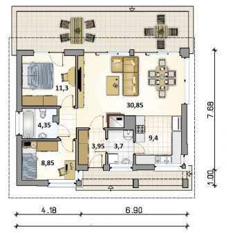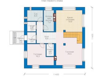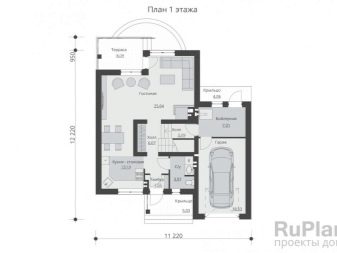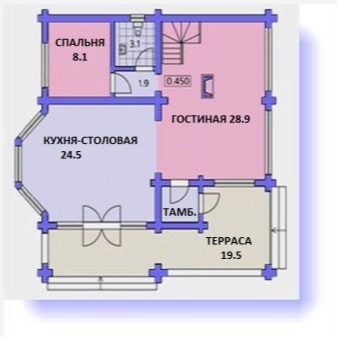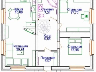 Добре е, ако успеете да организирате вход от коридора към банята и спалнята. Можете да влезете в хола, като преминете през кухнята-трапезарията. Стаята за приемане на гости не трябва да бъде по -малка от 28 кв. м, така че да е удобно да приемате голям брой гости. Планът на приземния етаж задължително трябва да включва място за инсталиране на допълнителни секции или големи цветя в саксии..