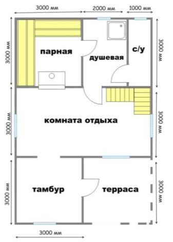 Дори едноетажна сауна с такъв размер ще изглежда доста просторна.. Освен основните стаи за лечение, всичко може да се планира. Съветваме ви да се съсредоточите върху проекта с вестибюл: тук ще бъде удобно да съхранявате обувки и връхни дрехи. В допълнение, преддверието ще предпазва основното помещение от студа..