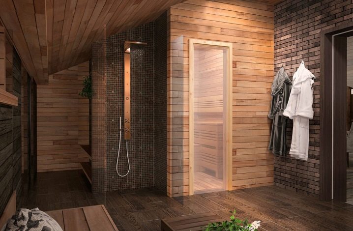 - Често пералнята се комбинира с парна баня.. Но трябва да знаете, че нормата на площ на човек е 1-2 м2. Най -добрата форма за водни процедури е квадрат. Обикновено многостепенните рафтове се монтират към стена без прозорци. А самата парна баня трябва да е в дълбините на банята.