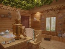 Резбовани капаци, дървени мебели и самовар с корем с гевреци просто се дърпа, за да се потопите в атмосферата на изконна руска баня с дълги чайове и интимни разговори.