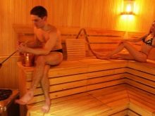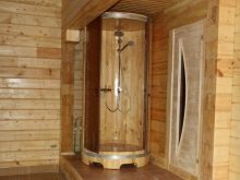 В ъгъла има душ кабина и шрифт, отсреща има рафтове с аксесоари за баня и кош за мръсно бельо. Нищо допълнително. Отворената врата ви кани да попиете горещия въздух в парната баня.