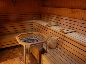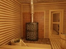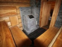 Печката, разположена срещу подовете, е безопасна, никой няма да се изгори върху нея и в същото време е удобно да се излива вода върху камъните, за да се даде пара.