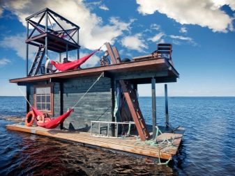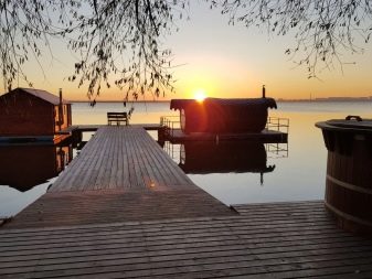 - Баните на сал се изграждат върху реки или изкуствени водоеми. Дървена рамка за баня е монтирана върху пластмасов или дървен понтон: в края на краищата плаващата конструкция не трябва да бъде тежка. Вътре в банята има съблекалня, парна баня, душ кабина и тоалетна. Присъствието на хора в една и съща баня е неприемливо, а броят им е строго регулиран в зависимост от теглото.