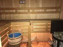 Стъпаловидни рафтове на две нива, вани с брезова метла, печка с камъни, малък прозорец с „дървесна“ рамка и мека светлина на прожектори – създават релаксираща атмосфера.