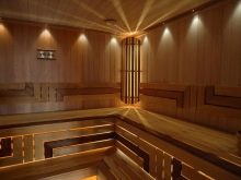 Мекото осветление на рафтовете в парната баня създава “плаващ” ефект, който прави целия интериор необичаен..