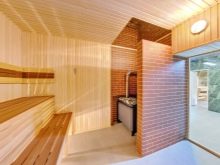 - Бреза, липа, трепетлика и кедър са идеални за декориране на подове, стени и рафтове. Дървесината от тези видове дървесина не се дърпа от влага и високи температури, при силно нагряване те няма да изгорят хората. За да предпазите дървения под от гниене, поставете дъските така, че водата да се влива в широките пролуки между тях. Ако харесвате подове от твърда дървесина, помислете за дренажна система.