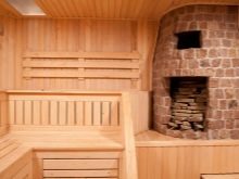 - Парната баня е стандартно оборудвана с печка и рафтове, които са подредени според правилото „колкото по -високи са рафтовете, толкова по -висока е температурата“. Според правилата за безопасност печката трябва да бъде завършена с тухли и да се намира срещу рафтовете. Традиционно на пода се полага дървен материал, използването на подови плочки също е допустимо, при условие че върху плочките се полагат дъски или дървени решетки. Е, брезовите метли, поставени във вани, ще подчертаят руския дух на банята..