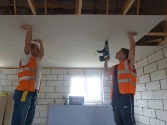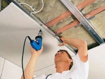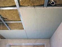 Таванът от гипс е заменен с опция гипсокартон. Такова покритие се извършва бързо и лесно ръчно с помощта на поцинкован профил и евтини листове от гипсокартон. Материалът перфектно скрива неравностите на тавана и ви позволява да прикриете комуникациите. Повредената зона е лесна за подмяна, а самият материал е екологично чист и безопасен, но нестабилен към влага и “изяжда” поне 4-5 см от височината на тавана.