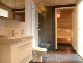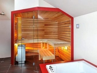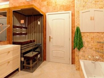 Понякога парните са инсталирани в много малки бани. Така че структурата не изглежда толкова обемиста в малка стая и визуално не намалява стаята, вратите за сауна са най -добре от стъкло.