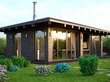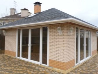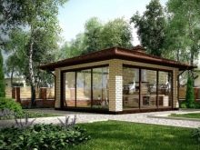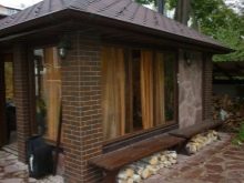 - Затворена беседка с прозорци от пода до тавана и външна облицовка от облицовъчни тухли в два цвята изглежда като напълно независима, пълноценна конструкция, загрята от фурна. Може да се използва не само като място за събиране на гости, независимо от времето, но и като пристройка за живеене..