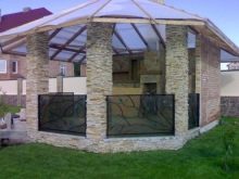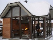 - Затворен тип. Всъщност структурата е представена под формата на малка тухлена къща. Може да се отоплява и има вентилационна система. Тук може да се монтира двоен стъклопакет и сигурна врата. С печка или електрическо отопление в такава стая можете да свалите връхните си дрехи дори при силна слана и удобно да прекарате времето си на масата в приятелска компания.