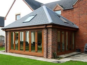 - Прикрепената остъклена беседка може да изглежда като продължение на къщата поради четирискатния покрив, повтарящ очертанията на основния покрив. Мащабното остъкляване и прозорците в тавана ще изпълнят вътрешното пространство със светлина и топлина. Тук ще бъде удобно дори при влажно, студено време.