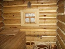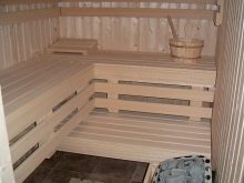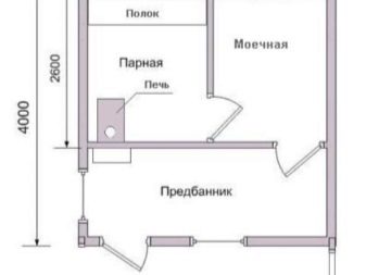 - Банята се състои от една стая, която е съблекалня, парна баня и мивка. По принцип при това оформление фурната (електрическа, тухлена) е инсталирана в ъгъла, за да се спести място. По протежение на стената има рафтове на две или три нива за парна баня, както и рафт за тоалетна.