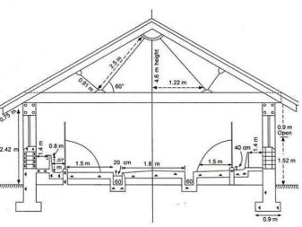 Най -често за покрива на навеса се използват шисти или керемиди. Фермите, разположени в южните райони, използват поликарбонат за тези цели. Много е добре, ако под покрива се създаде въздушна междина под формата на таван. Това позволява топлината да остане на закрито при силни студове. Освен това таванското помещение може да бъде чудесно място за съхранение на някои видове храна и различни прибори.