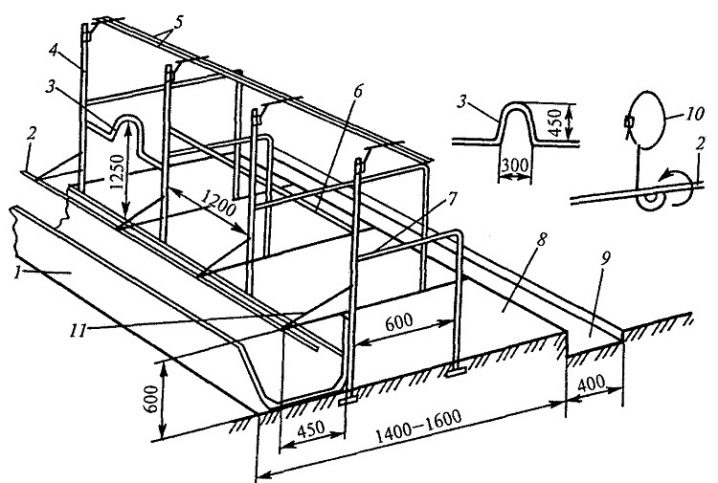 Съвременните сергии обикновено са проектирани така, че ширината е малко повече от 1 м, а дължината е 1,7-2 м.. Хранилките са най -добре разположени отпред, а коритата за оборски тор отзад. В този случай размерите на последния трябва да бъдат 20×10 cm (съответно ширина и дълбочина). Тук също е важно да се вземе предвид наклона на пода, така че суспензията да тече по -добре. За съхранение през зимата на каишка с дълбоки легла, събирачът на каша не е задължителен елемент..