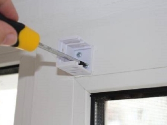 - Когато се завинтват скобите, върху тях се закача корниз. Тя може да бъде фиксирана по няколко начина. Най-удобният е механизмът със самозаключващи се брави. По-прости продукти трябва да се завинтват към рамката с помощта на самонарезни винтове или винтове.