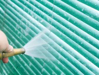 Изправените тъкани трябва да се перат около два пъти годишно, за да се поддържат чисти.. Такива завеси трябва да се перет, както следва: издърпайте веригата с тежести от всички платна отдолу, отстранете всички ламели от стрехите. След това се слага във вана и се накисва в топла вода с прах или се използва пароструйка. Тъканта може да се търка леко с четка и препарат. Вместо сух прах за пране, трябва да използвате гел, за да не разваляте тъканта..