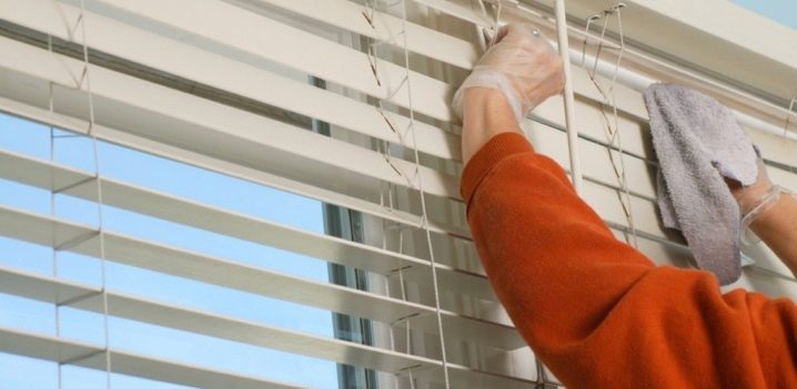 Хоризонталните щори от алуминий се избърсват с мокра гъба директно върху прозореца или се перат в банята под душа. За удобство ламелите могат да бъдат окачени на веревки или прикрепени към плочки върху вендузи. След това трябва да обработите повърхността на едната страна с препарат от спрей бутилка, да измиете мръсотията със струя вода, да я обърнете и да повторите операцията. Ламелите са леко извити, така че водата трябва да се води под ъгъл за оптимално почистване. Ако на повърхността има мазнина или дебел слой прах, тогава дъските трябва да се оставят да се накисват за кратко..