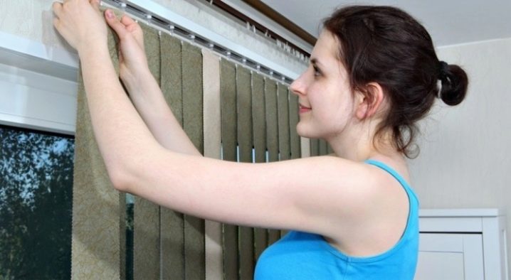 Ако при премахване на вертикалните щори корнизът също е отстранен, тогава преди да монтирате завесите обратно на стената, съберете всички ламели от едната страна. Елиминирайте всички неравности и гънки и ги закрепете с кламер (гумена лента), тогава те няма да пречат на монтажа на пердето. Може лесно да се прикрепи с две щраквания, без да са необходими допълнителни инструменти.. Единственото нещо е, че може да е трудно да поставите корниза възможно най -равномерно, така че крепежните елементи да се вписват перфектно в каналите.. Ако структурата е твърде голяма, помолете някой за помощ. Ако ламелите бяха отстранени отделно, тогава в този случай просто ги инсталирайте един по един в държачите..