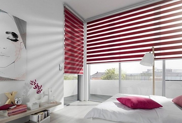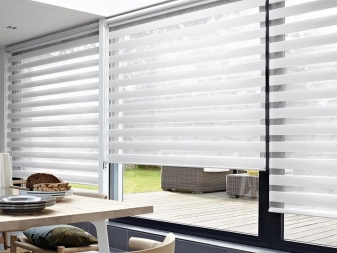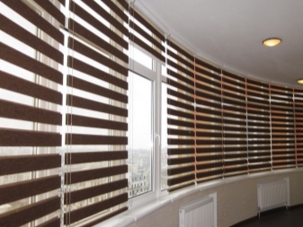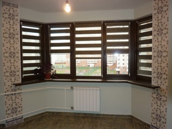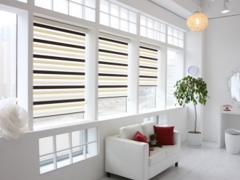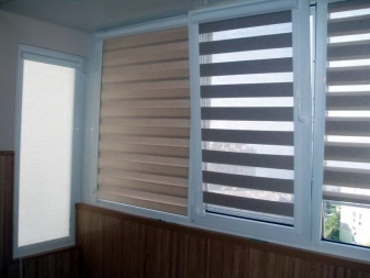 Плътната висококачествена тъкан няма да пропуска слънчевите лъчи в стаята. В случай на местоположението на балконската стая в северната част на апартамента, щорите се избират от полупрозрачна тъкан. Много често балконът се използва като зона за отдих, кабинет или читалня, както и зимна градина с много цветя. В тази област можете да създадете уют с включването на топли цветове в цветовете на завесите. Минималистичната работна зона изисква минимум аксесоари и дискретен дизайн в интериора си. В такава стая дневните и нощните щори трябва да бъдат изпълнени в един цвят без рисунки или с прост геометричен орнамент..
