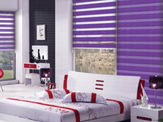 Двуцветните щори, които съчетават актуални нюанси: тюркоазени и бели, прахообразни и розови, жълти и лилави тонове изглеждат изгодни..