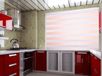 Такива щори за кухнята служат като успешен пример за ефектен интериорен дизайн. В нейния интериор е подходящо да се използват щори със средни тонове с модел на дъга. Цветните тъкани са практични. Замърсяването не се вижда върху тях, за разлика от обикновените завеси. В допълнение, ярките щампи по -добре скриват недостатъците в тъканта. Цветните щори изглеждат ефектно, дори от евтин материал. А в монохромните продукти евтиността на материала ще бъде забележима. Ето защо, за да спестите пари, е за предпочитане да изберете ярък орнамент на прозорците..