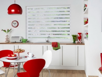 - В кухнята можете да използвате дизайни в богати цветове. Кухнята често е място за пиене на чай и приятно забавление, затова за това описание са избрани щори със съответните „вкусни“ нюанси: праскова, шоколад, тропически слънчеви. Това могат да бъдат например жълти или оранжеви мини-касетни завеси от естествена тъкан. Щорите трябва да са в хармония с цветовата схема на кухненските мебели и дори с един аксесоар. Спазването на всички критерии ще създаде атмосфера на една цяла композиция в стаята..