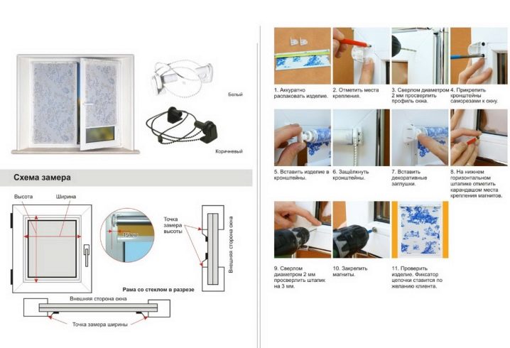 Изчисляването на ширината и височината на такива завеси се извършва по същия начин, както в случая на ролкови модели. Основните разлики се крият в монтажа на готови щори. Освен това е необходимо предварително да се вземе решение за ширината на ламелите. Този параметър трябва да бъде избран в зависимост от размера на прозореца – колкото по -широк е той, толкова по -широки ще бъдат самите ламели. Хоризонтални щори от този тип обикновено се фиксират върху скоби, които се монтират на прозорци с помощта на специална лепяща лента. Всичко, което се изисква в този случай, е да поставите самите щори директно върху скобите и да ги фиксирате с самонарезни винтове, след което да ги залепите с помощта на специална лента към горната част на прозореца и към долната според данните на предварително направеното измерване. Такава инсталация отнема много малко време и освен това не изисква използването на специални инструменти..
