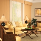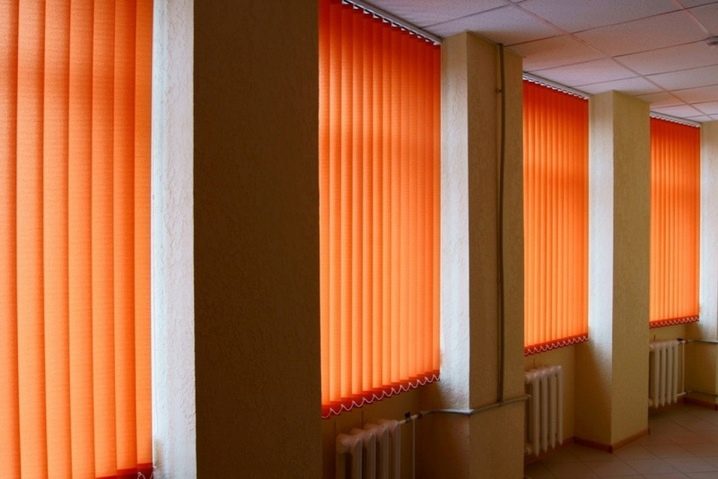 Вертикални щори големи размери и приятен оранжев цвят помагат да се украси красиво и стилно изхода към балкона. В същото време те създават приятен здрач в самата стая. Цветът на такива вертикални завеси може да бъде абсолютно всеки, докато може да бъде или в общата цветова схема, или да се откроява силно от нея, превръщайки се в ярко петно в интериора.