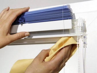 Общото почистване се състои в измиване на продукта. Ролетни и римски щори просто се изваждат от стрехите и се поставят в плик за пране, след което се перат в машина. По -добре е да изберете деликатен режим или режим, който съответства на материала на производство. Щорите, състоящи се от ламели, първо трябва да бъдат разглобени на отделни части. Всяка ламела се навива на плътно руло и се поставя в платнен плик, който след това се поставя в сапунен разтвор. Ламелите трябва да се накисват за около половин час, след това леко да се изплакнат директно в торбата и след това в чиста вода. По -добре е да перете такива щори с ръце. В края на процедурата щорите трябва да се изсушат разгънати върху равна повърхност, след което да се съберат отново и да се поставят върху корниза..