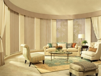 Експерименти са допустими в жилищно пространство, особено ако прозорците са ниски, тъй като вертикалните щори визуално разтягат пространството нагоре. Комбинираните опции, ламбрекени и тюл, дълги ламели към пода изглеждат красиви.