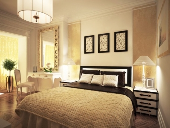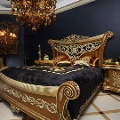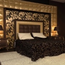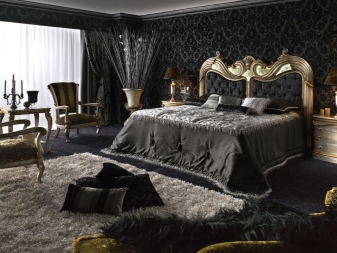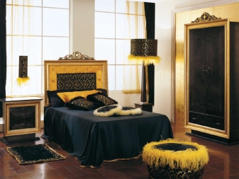 - Черно със злато – комбинация от крале. Много често виждаме такава симбиоза в класически интериор. Следователно, спалнята в черно и златно ще създаде впечатление на въодушевление, тържественост. Златото се използва за декоративни елементи: изящна настолна лампа, декор на табла ще добави изискан щрих към спалнята.