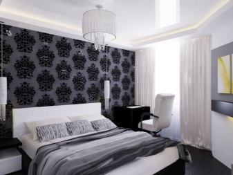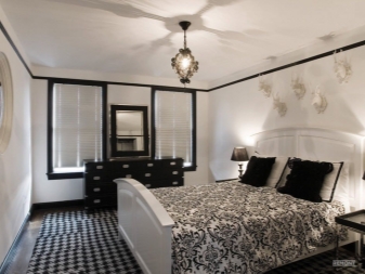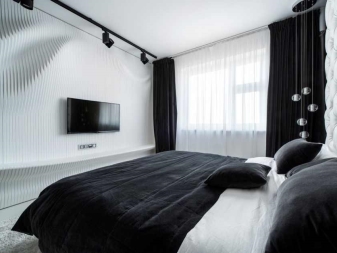 Ако цветовата палитра на декорацията на спалнята е скромна и се състои само от два цвята, черно и бяло, е необходимо интериорът да играе с помощта на различни декоративни елементи и текстури. Например, това може да бъде декорация на стена под формата на водни вълни. Голямото, подплатено табло създава приятно усещане. Стената може да се превърне и в пряко продължение на черната табла. Откриват се много интересни възможности при използването на разнообразни щампи и шарки, които ще направят интериора оригинален.
