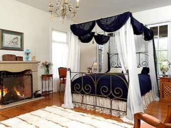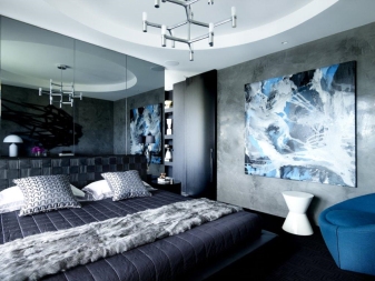 В интериора с основния черен цвят такива елементи на декора като огледала, лампи, картини и други атрибути са от голямо значение.. Ако планирате интериора правилно, тогава чернотата на стените не може да направи спалнята мрачна. За да направите това, трябва да откраднете повърхността на тавана в бяло и допълнително да използвате бяло в дизайна на интериорните елементи. Всички тези нюанси ще направят спалня, където цари уют и комфорт..