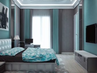 - Много интересна тюркоазено-черна тема в дизайна на спалнята. Равновесието на тюркоаза го прави безспорен лидер в синьо-зелената гама. Дори и намек за тюркоаз е достатъчен, за да промените облика на вашата спалня..