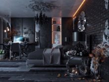 В черен интериор на мебелите се отделя много внимание. Интересно е, че както белите, така и черните мебели ще изглеждат еднакво впечатляващи. Само черното трябва да е лъскаво, в противен случай ще се загуби в пространството на стаята на фона на тъмните стени.