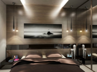 При проектирането на интериор на спалня е изключително важно правилно да се разработи схема на осветление, по -добре е тя да е разположена на няколко нива. Например, можете да осветявате периметъра, по протежение на корниза, а също така да осветявате вътрешните мебелни части – вътре в шкафовете, над леглото, линията на рафтовете. По този начин, в допълнение към обичайното окачване на тавана в центъра, е необходимо да се допълни с прожектори в определени части на тавана, настолни лампи, локални лампи, подови лампи, които осветяват определени участъци от стените. Особено внимателно трябва да подчертаете онези части от стената, където няма светъл декор..