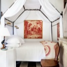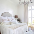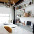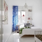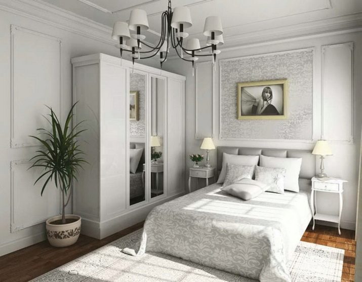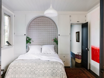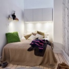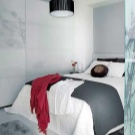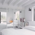 - Бяла спалня. В интериора се използват бели цветове, текстилът е контрастен аксесоар. Предназначението на стаята изключително за спане определи състава на мебелите. На площ от 9 кв. м. нямаше място за нощни шкафчета, би било невъзможно да се използват шкафове. Дизайнът е лек, ефирен поради бялото покритие, а също и благодарение на системите за точково осветление. Като системи за съхранение – бели рафтове до тавана. Огледалото визуално увеличава пространството на стаята.